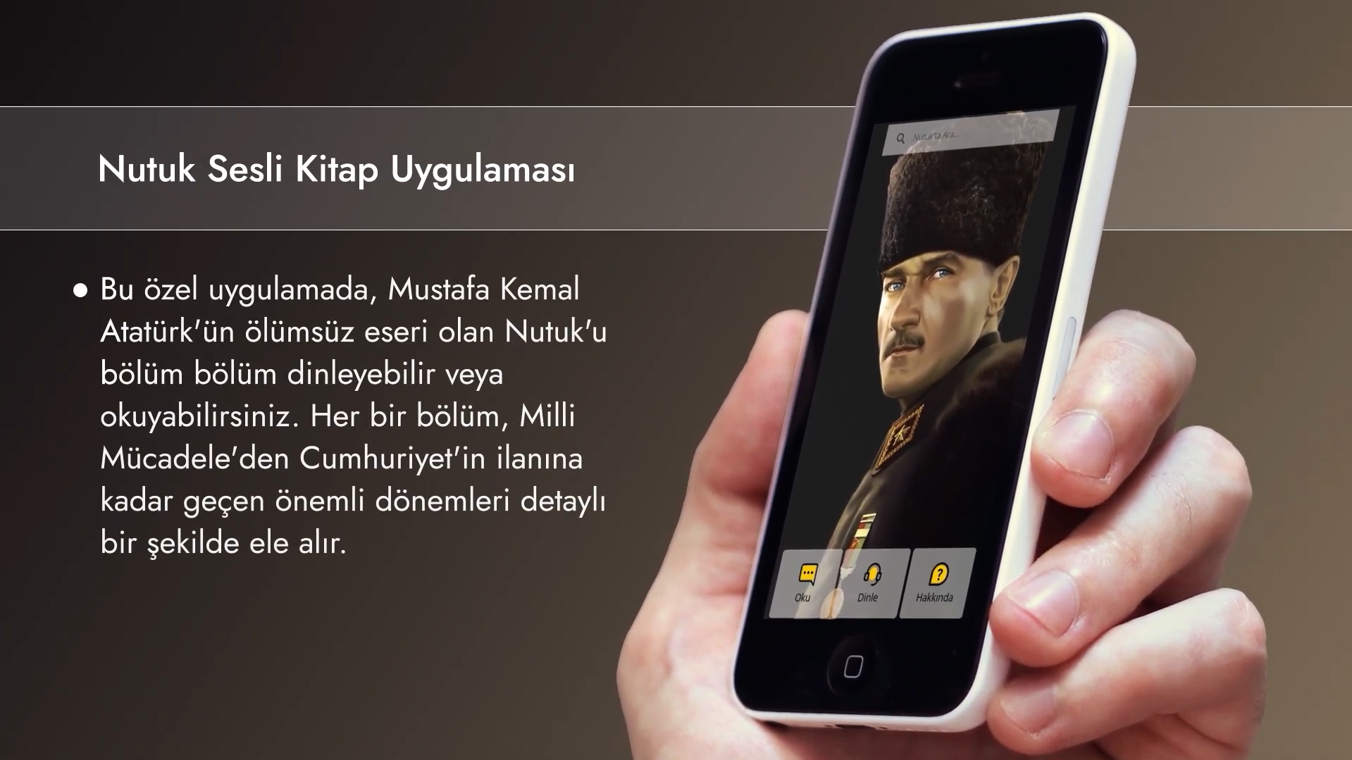 Türkiye Cumhuriyeti’nin kurucusu Mustafa Kemal Atatürk’ün en önemli eseri Nutuk, şimdi mobil uygulama olarak her an erişebileceğiniz bir formatta sunuluyor. Bu sosyal sorumluluk projemiz kapsamında, Nutuk’un tamamını hem sesli dinleme hem de yazılı okuma seçenekleriyle kullanıcılarımızın hizmetine sunduk.